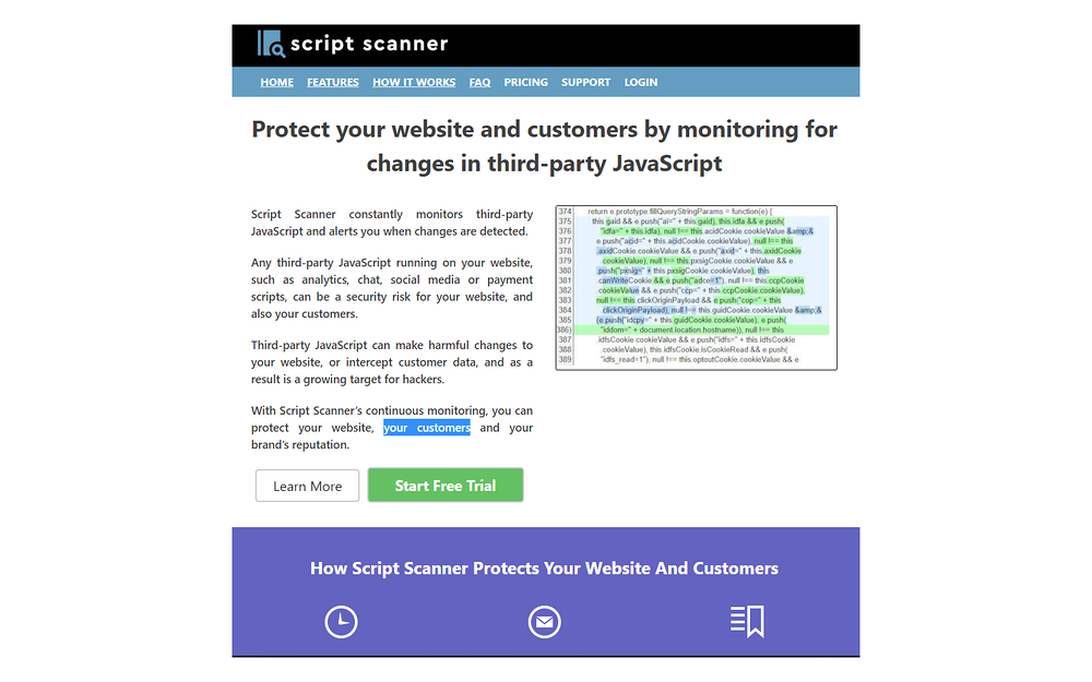 O Script Scanner monitora constantemente JavaScript de terceiros e o alerta, via notificações do Slack, quando quaisquer alterações são detectadas.